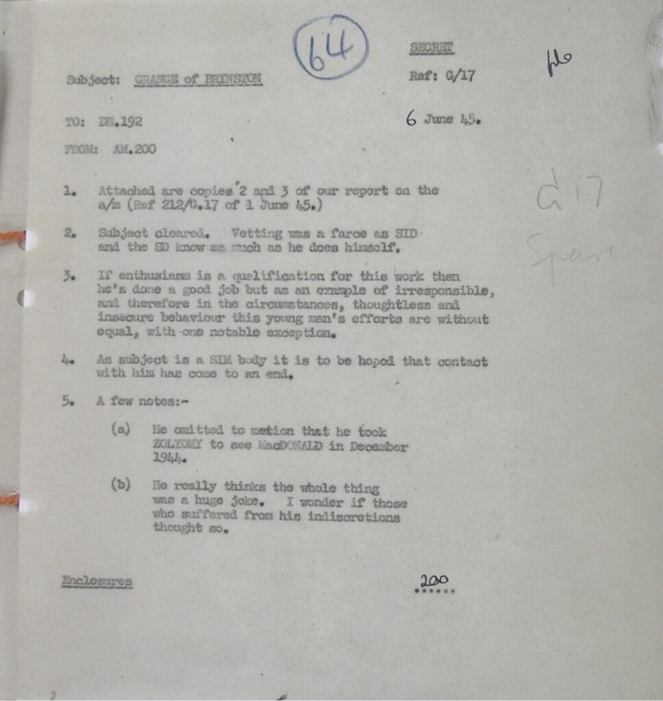 Dura la valutazione su Teresio Grange da parte dei capi del SOE;