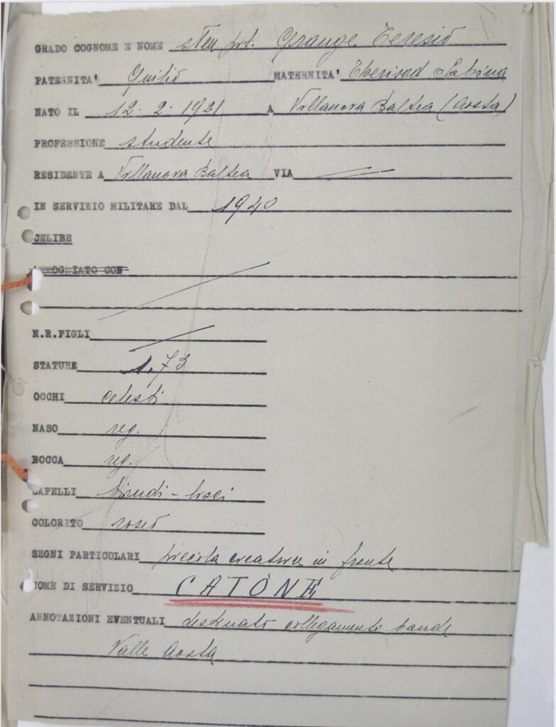 Soltanto qualche pagina dopo, troviamo scritto a penna finalmente che Teresio Grange è nato il 12 – 2 -19 a Genova dal fu Giulio e dalla fu Therisod. Era residente a Nettunia, di professione geometra, celibe, alto 1 metro e 73, occhi e capelli castani, naso e bocca regolari. Saranno vere queste generalità o di copertura visto che sono scritte a penna di lato? Nelle pagine successive, queste informazioni verranno smentite, pure la data di nascita.