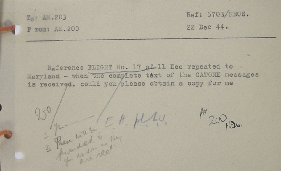 Si parla poi di un volo verso Maryland in cui i messaggi di Catone sono coinvolti. (Maryland non esiste, era il nome in codice dato alla base segreta britannica del SOE in Sud Italia, n.d.a.).