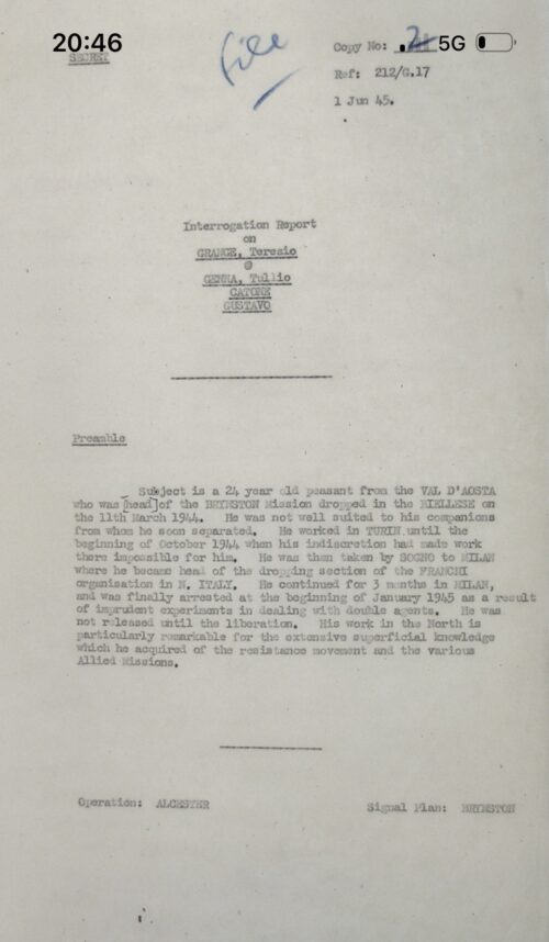 Seguono pagine e pagine con i dettagli su tutte le sue missioni. Ogni descrizione, seppur dall’apparenza insignificante, annotata con cura. Dopo tutto Catone, Teresio Grange era stato un corpo del SIM, ovvero dei servizi segreti fascisti. Ma i britannici erano meticolosi con tutti, anche con i propri agenti. Per questo i loro servizi segreti, il SOE ed il SIS, accanto all’OSS americano, erano di gran lunga superiori a quelli dell’Asse.
