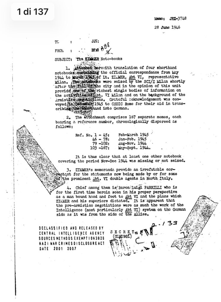 Il ruolo chiave di un italiano, il barone Luigi Parrilli. ‘Si suggerì di contattare l’intelligence alleata in Svizzera attraverso il barone Luigi Parrilli, ex rappresentante delle società Kelvinator e Nash in Italia. Parrilli aveva lavorato con Zimmer, ma aveva anche contatti con i partigiani italiani’. Secondo questo report le narrazioni italiane sull’Operazione Sunrise furono imprecise e faziose